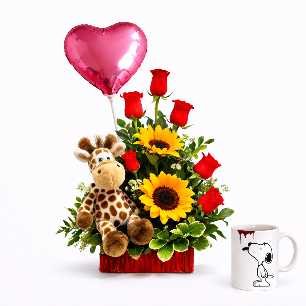 Este delicado diseño está compuesto por 6 girasoles radiantes que transmiten calidez y energía positiva, acompañados de una hortensia de suaves tonos que aporta delicadeza al conjunto. Incluye un pequeño peluche antialérgico (modelo sujeto a disponibilidad) que añade un toque tierno y especial. El arreglo se complementa con follaje fino natural y se presenta sobre un elegante box decorado que realza su belleza.
