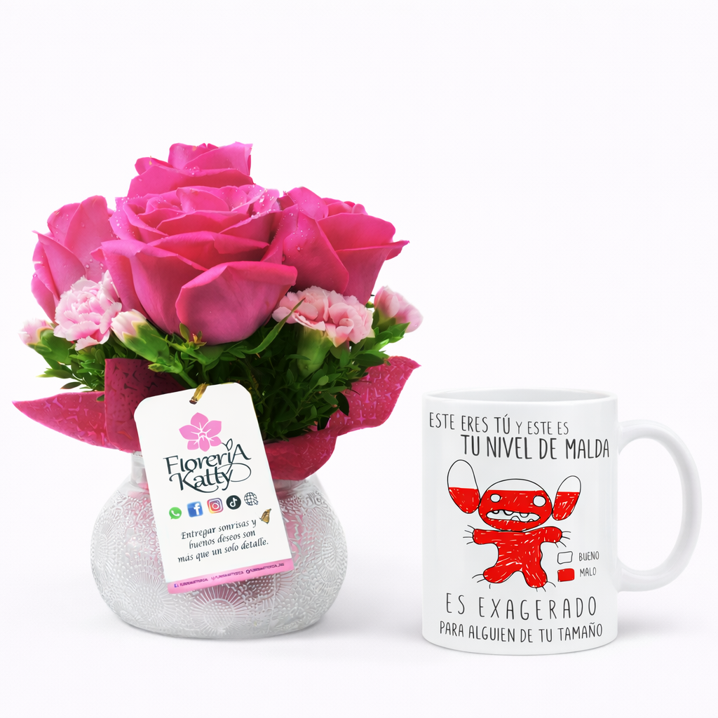 Elaborado con 6 rosas importadas y 8 claveles importados, acompañado de delicado follaje fino y envuelto en tela especial, todo presentado sobre una base que realza su belleza y armonía.