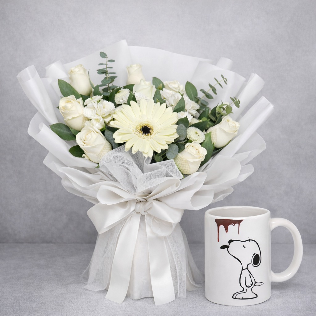 Elaborado con seis rosas rojas que aportan elegancia y romanticismo, acompañado de un lilium rosado que brinda un toque de frescura y distinción. Se complementa con delicados toques de flores silvestres y se presenta con una envoltura especial que realza su estilo natural y armonioso.