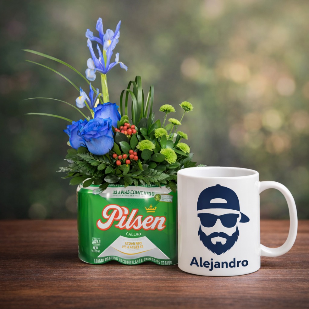 Este elegante arreglo floral combina 3 rosas azules, flores de iris y follaje fino, creando una composición fresca y sofisticada. Incluye un six pack de cerveza de 473 ml y una taza personalizada, ideal para agregar una frase o imagen especial y sorprender con un detalle original.