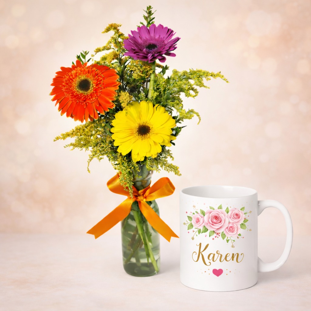 Este hermoso arreglo está compuesto por 3 gerberas de colores vibrantes, que aportan alegría y energía, acompañadas de follaje fino que añade frescura y delicadeza. Se presenta sobre una base de vidrio elegante e incluye una taza personalizada, ideal para agregar una frase o imagen especial.