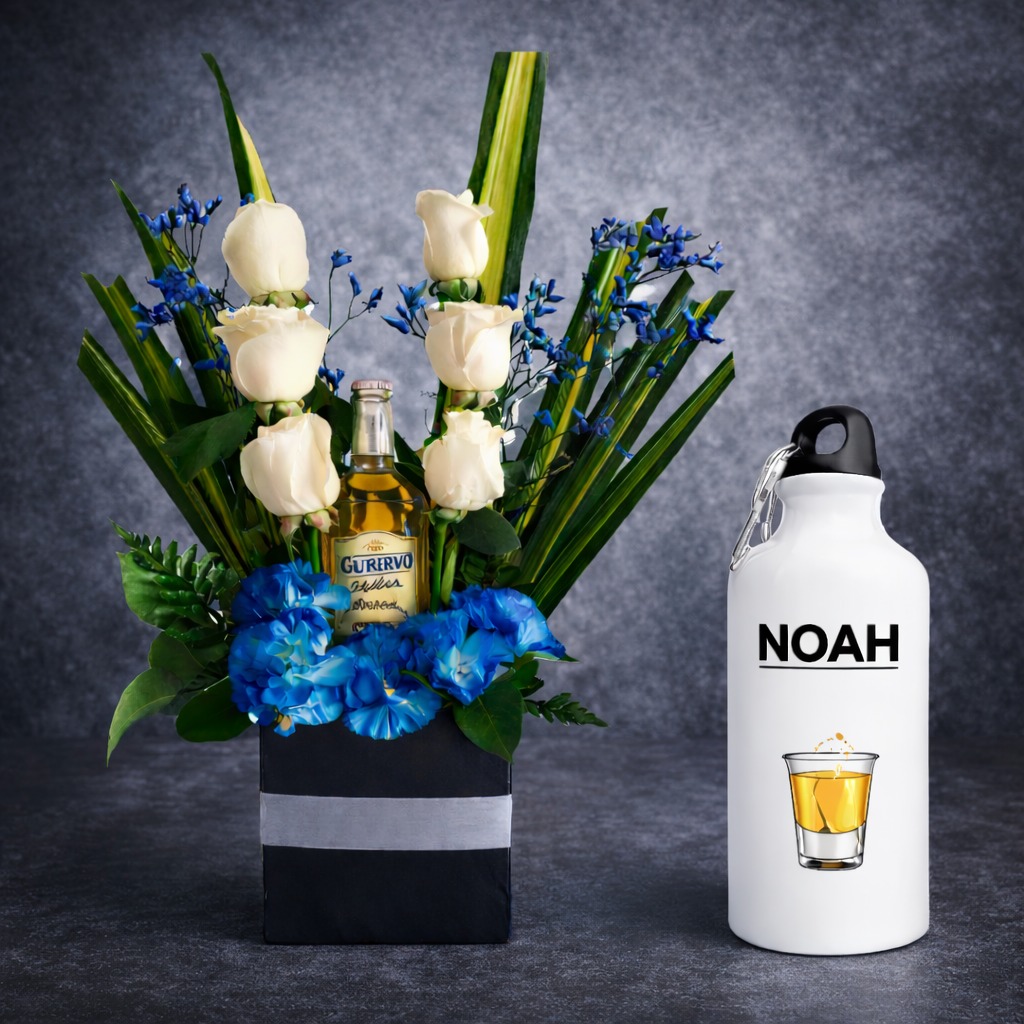 Este elegante arreglo incluye 6 rosas importadas, claveles multicolor y follaje fino de vivero, creando un diseño sofisticado y fresco. Incluye una botella de cerveza Corona (210 ml) y un tomatodo personalizado, ideal para agregar una foto o frase especial.