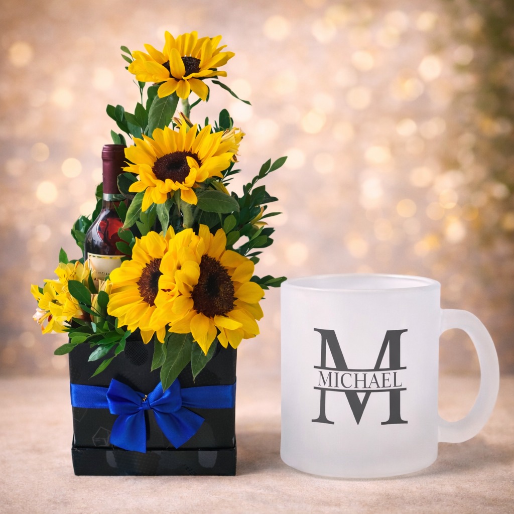 Este hermoso arreglo floral está compuesto por 4 girasoles, cuyas flores radiantes aportan alegría y frescura, iluminando cualquier espacio con su vibrante color amarillo. Incluye una botella de vino rosé (750 ml) y una taza personalizada, ideal para agregar una frase o imagen especial.
