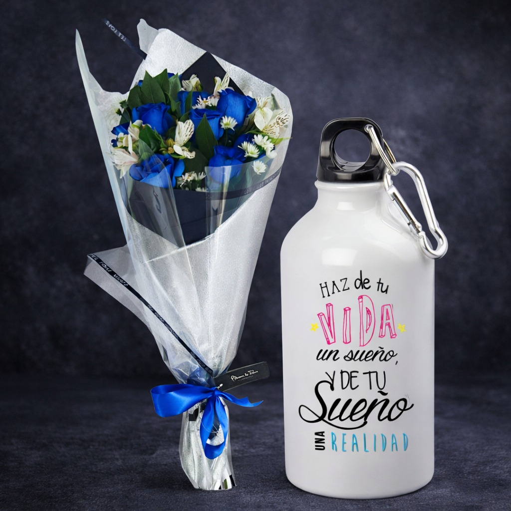 Este hermoso arreglo floral está compuesto por 10 rosas azules importadas, que aportan elegancia y romance a la composición, acompañadas de astromelias de colores variados, las cuales añaden textura y un toque especial al diseño. Incluye un tomatodo personalizado de aluminio, ideal para agregar la foto o frase que desees.