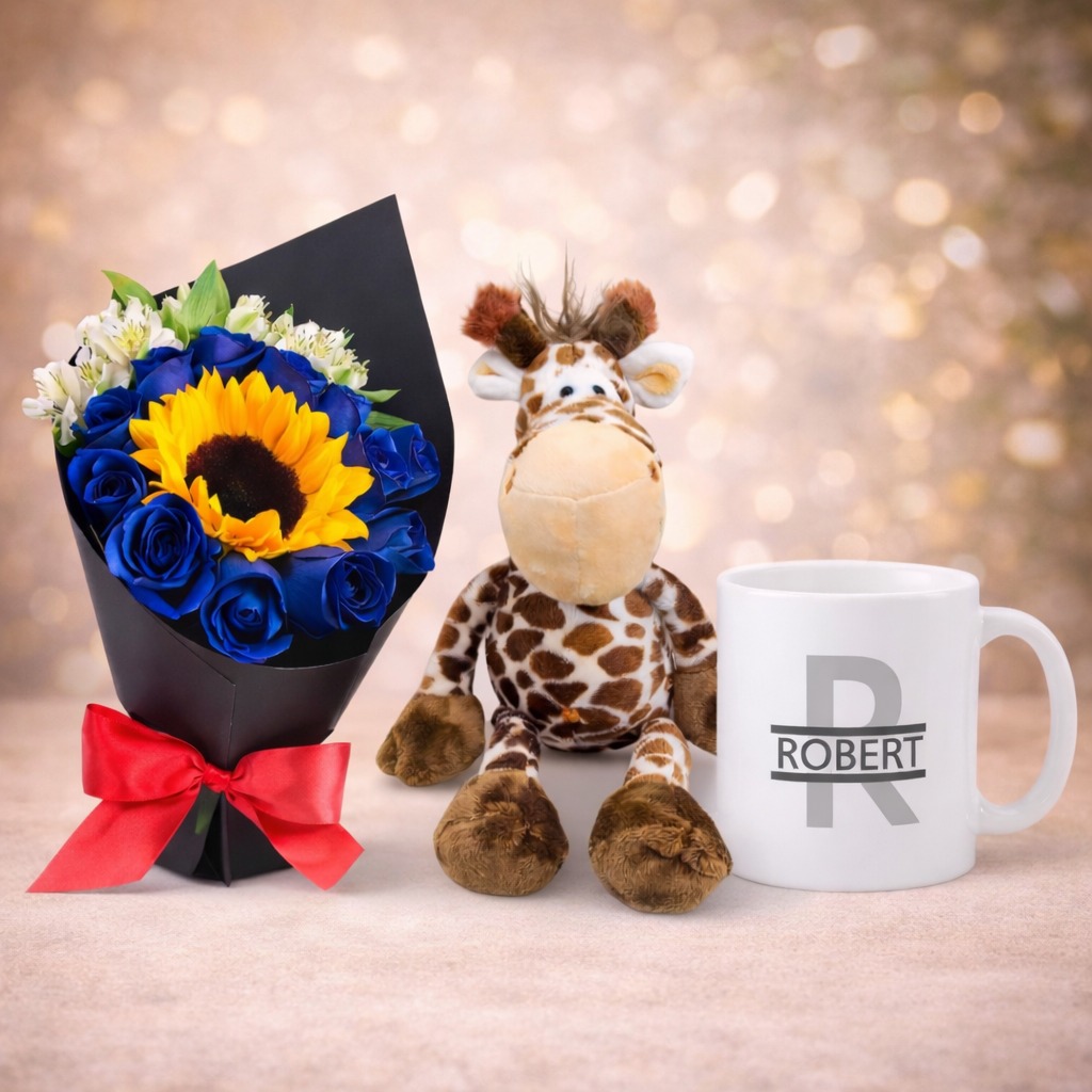 Este hermoso arreglo floral está compuesto por 10 rosas azules, que aportan un toque elegante y sofisticado, transmitiendo serenidad y admiración. Se complementa con 1 girasol y astromelias, creando un diseño armonioso y lleno de significado. Incluye una taza personalizada y un peluche de jirafa antialérgico, ideal para sorprender con un detalle tierno y especial.