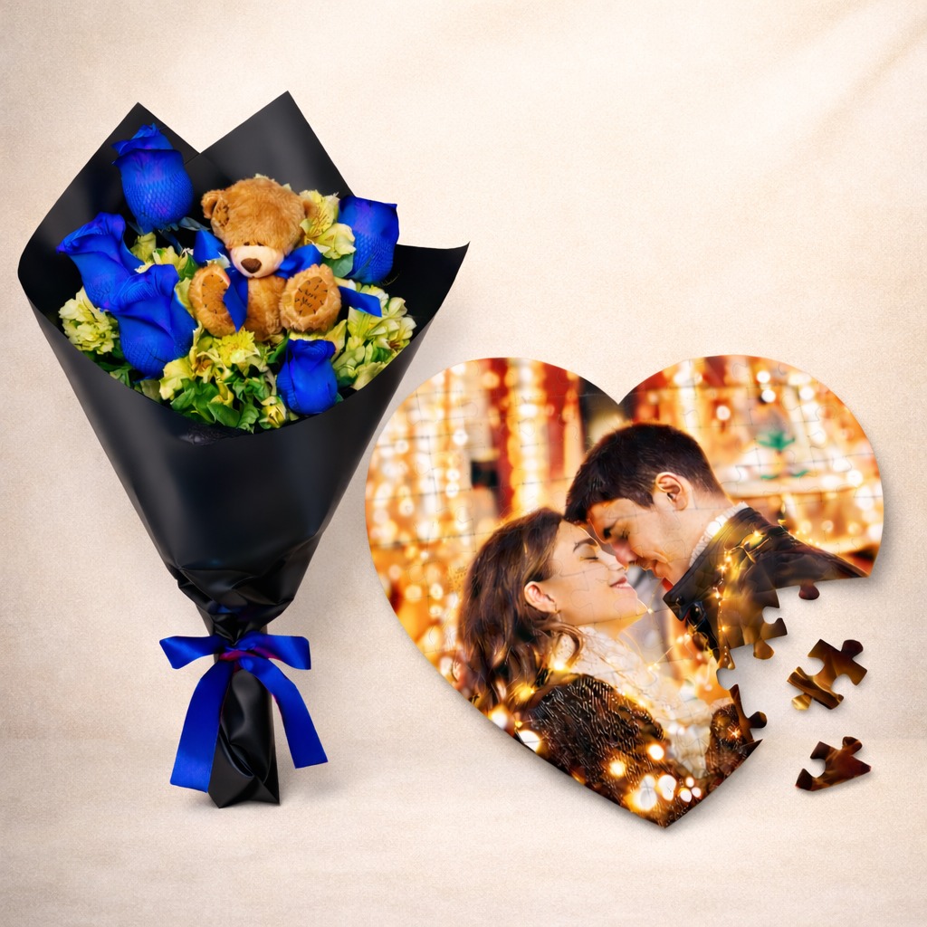 Hermoso arreglo compuesto por 5 rosas azules importadas y astromelias de tonos suaves, que aportan serenidad, armonía y elegancia. Incluye un peluche antialérgico y un rompecabezas sublimado personalizado en forma de corazón, creando un detalle tierno y significativo.