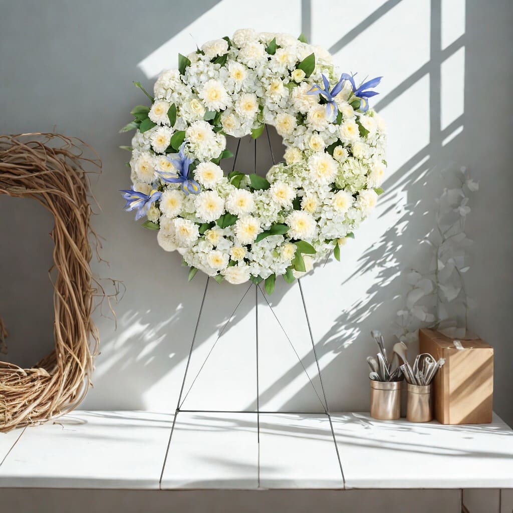 Esta hermosa corona floral ha sido elaborada como un homenaje lleno de serenidad y elegancia.