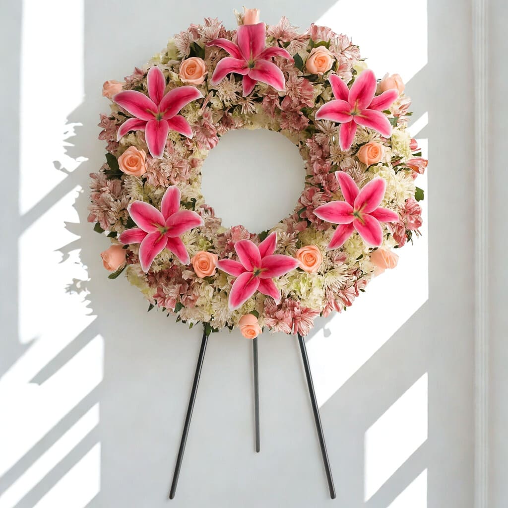 El arreglo se presenta sobre un parante de fierro, que aporta firmeza y realza su presencia solemne. Ideal para momentos de despedida, esta corona floral es un tributo visualmente impactante y lleno de sensibilidad.