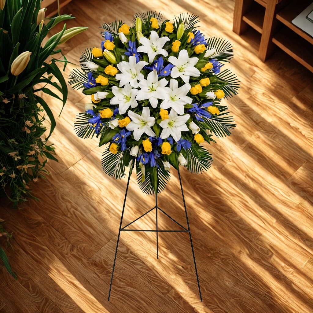 Este elegante arreglo floral en trípode ha sido diseñado como un último homenaje lleno de serenidad, luz y gratitud.