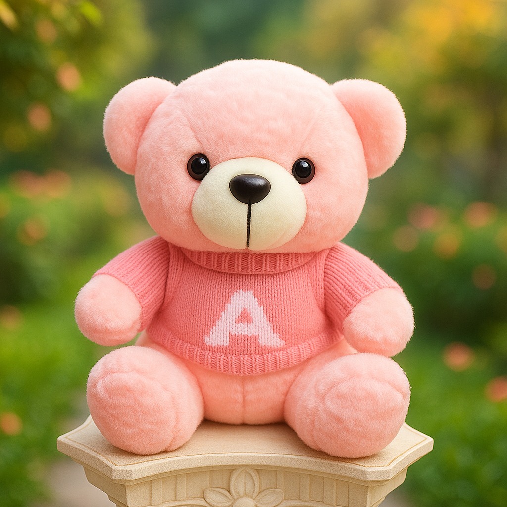Tierna osita rosada antialérgica, suave y encantadora, con una ropita que luce la letra “A”, ideal para sorprender en cualquier ocasión.