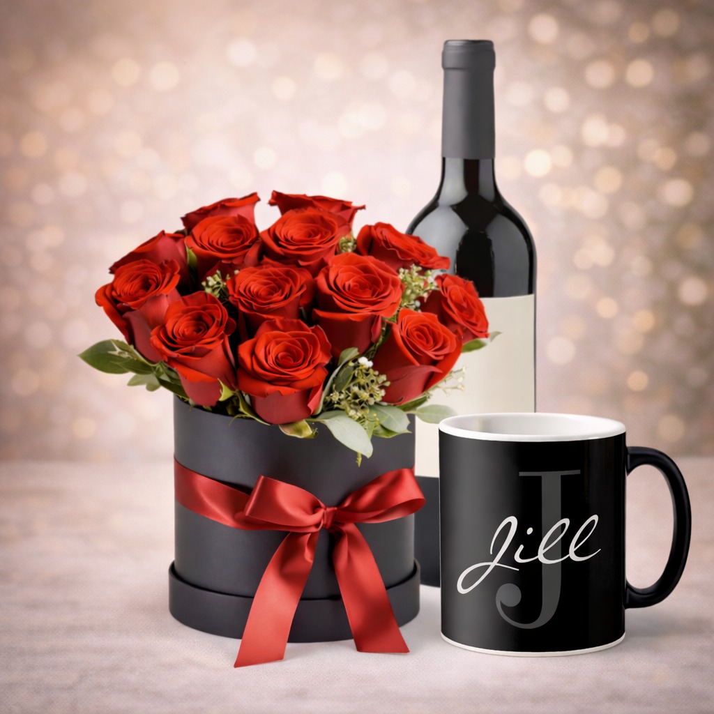 Este elegante detalle incluye una botella de vino tinto Queirolo de 750 ml, acompañada de un hermoso arreglo de 10 rosas rojas importadas, que simbolizan amor y admiración. El follaje natural realza la composición y se presenta en un box redondo negro. Incluye una taza personalizada, ideal para agregar una frase o imagen especial.