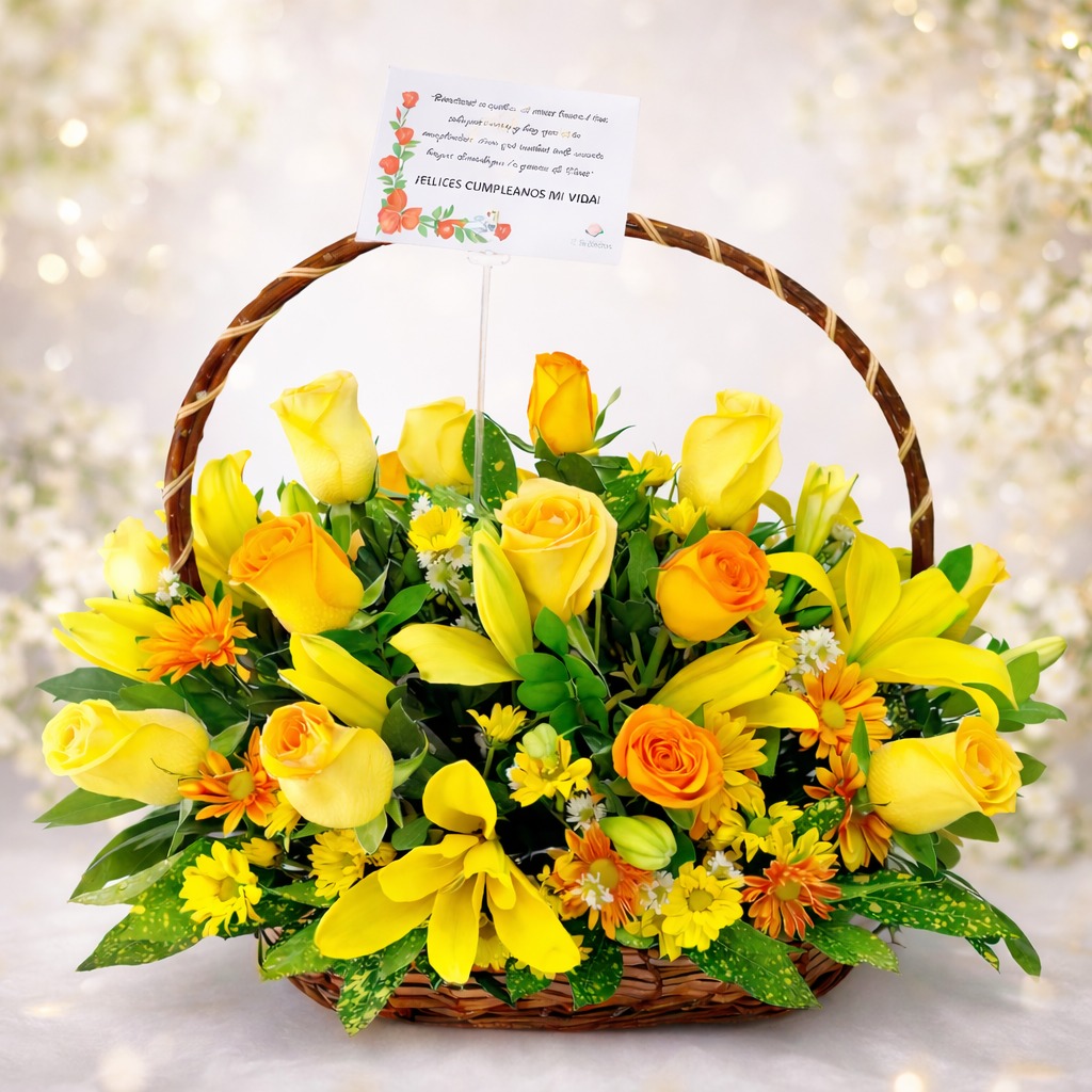 Hermoso arreglo floral en canasta de mimbre, compuesto por 10 rosas amarillas, margaritas, 4 lilium amarillo y follajes naturales, creando una combinación vibrante y elegante. Este arreglo destaca por su color, frescura y armonía, ideal para transmitir alegría y buenos deseos en cualquier ocasión.