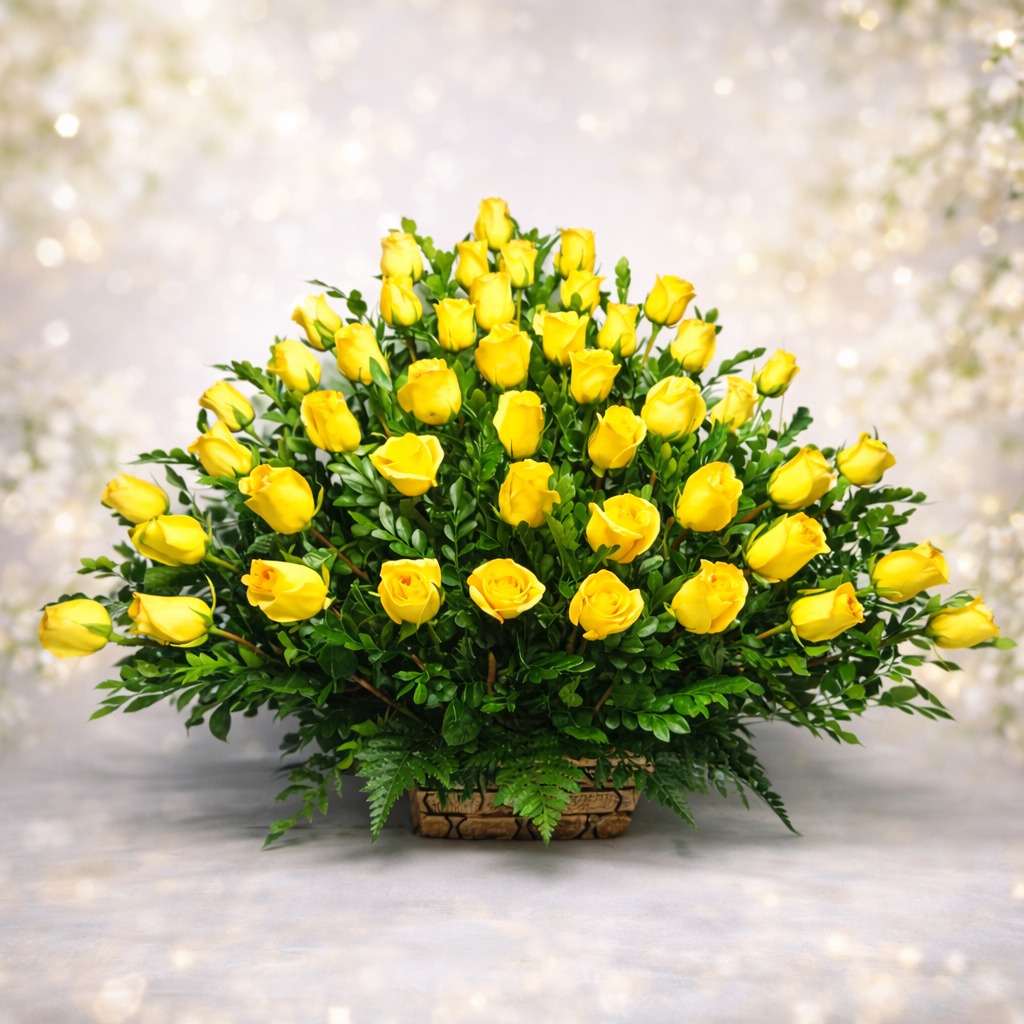 Arreglo floral con 50 rosas amarillas importadas, acompañadas de follajes finos de vivero y presentadas en una elegante base de cerámica. Un diseño vibrante y sofisticado, ideal para transmitir alegría, gratitud y buenos deseos en cualquier ocasión especial.