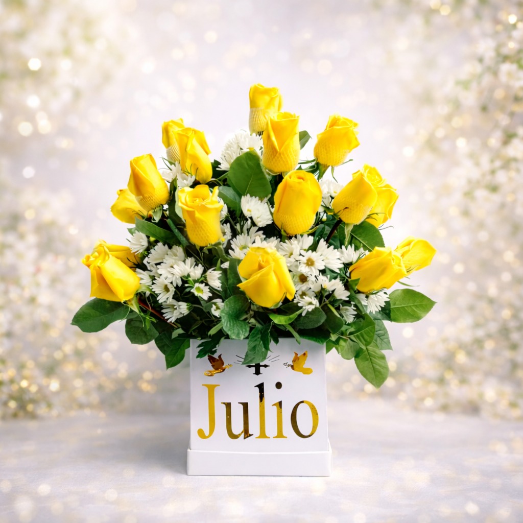 Este delicado arreglo floral está compuesto por 15 rosas amarillas frescas, que simbolizan alegría y buenos deseos, acompañadas de margaritas blancas que aportan pureza y armonía. Los follajes finos realzan la belleza del conjunto, creando un equilibrio natural y elegante. Presentado en un box blanco, este diseño destaca por su frescura, luz y estilo, ideal para sorprender en cualquier ocasión especial.