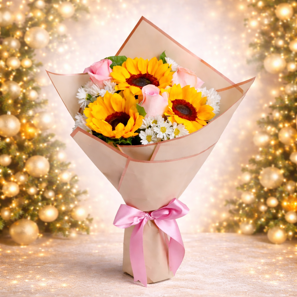 Este delicado ramo está compuesto por 3 girasoles radiantes, 3 rosas rosadas y margaritas blancas, creando una combinación armoniosa de luz, ternura y frescura. Presentado en una envoltura especial que realza la belleza natural del arreglo, es ideal para expresar cariño y buenos deseos en cualquier ocasión.