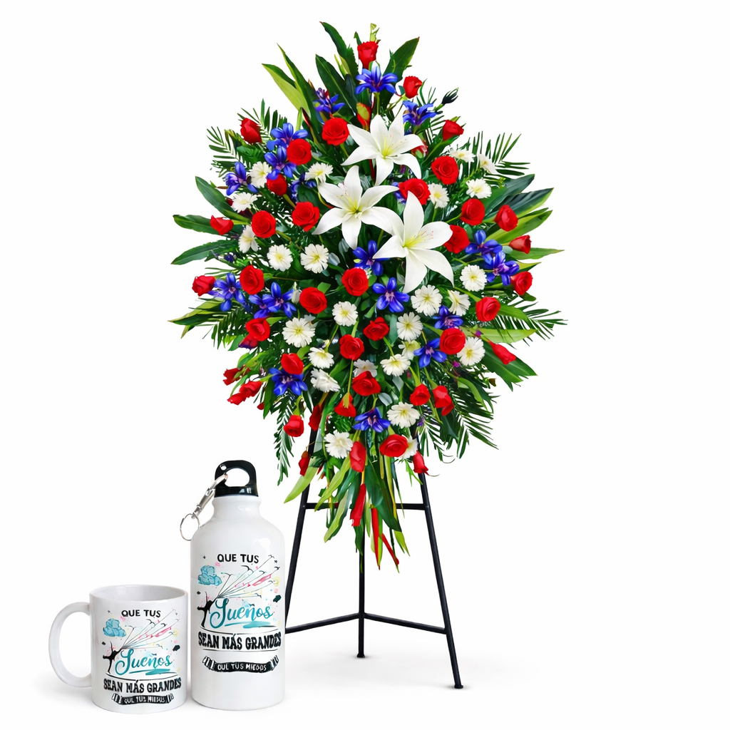 Elegante arreglo floral presentado en base, elaborado con 12 rosas rojas importadas y 5 girasoles frescos, acompañados de follaje fino que realza la combinación de colores y formas. Un detalle ideal para transmitir amor, alegría y buenos deseos en cualquier ocasión especial.