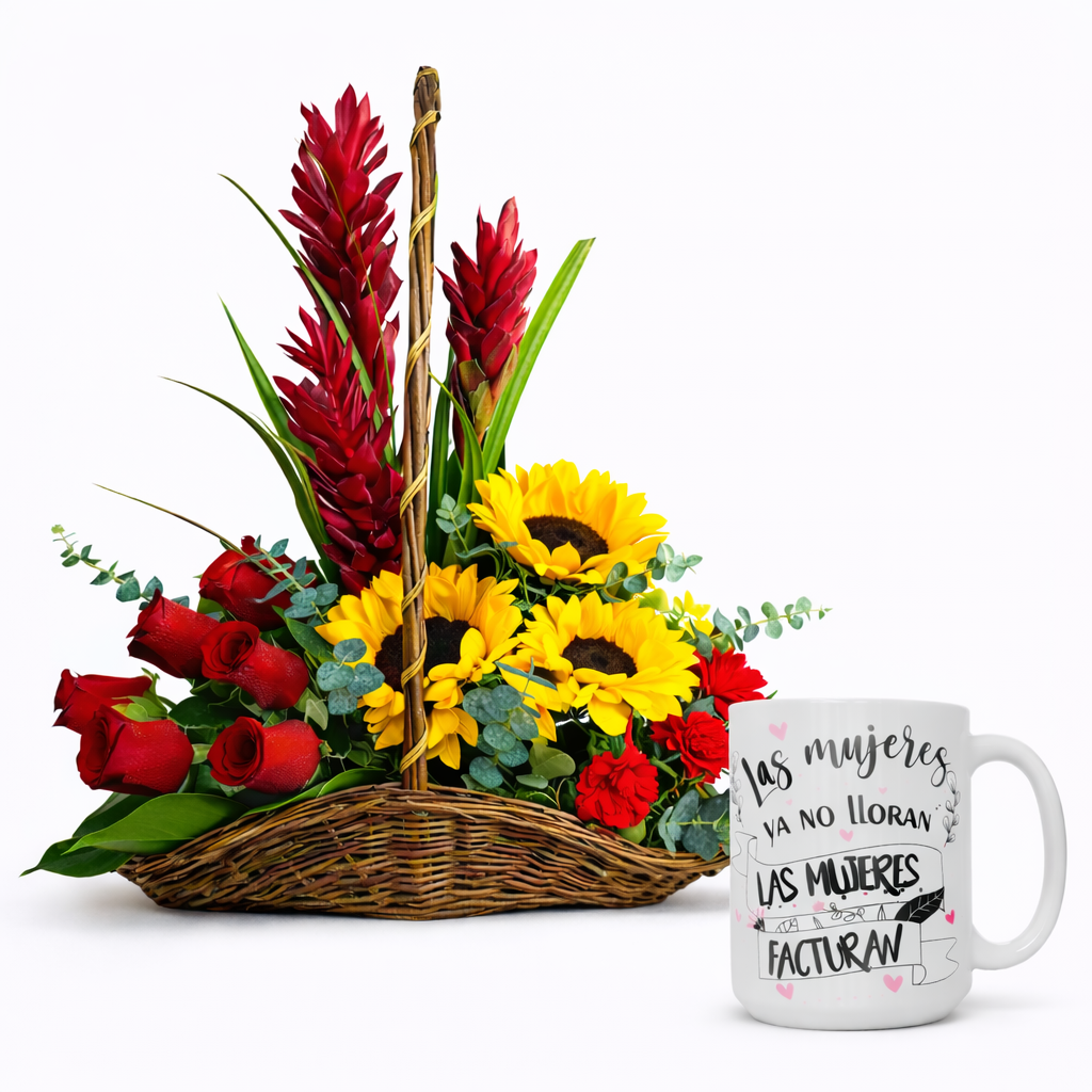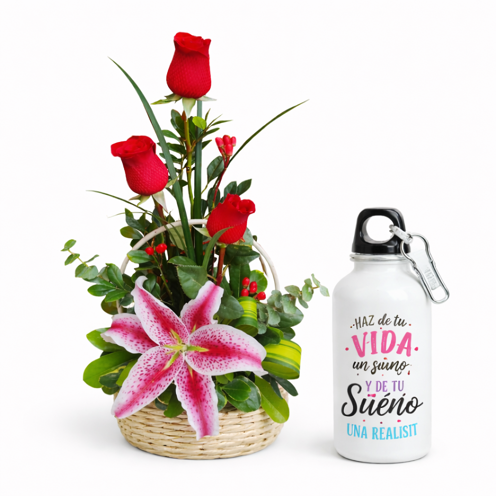 Hermoso arreglo compuesto por 14 rosas rojas importadas, un lilium rosado aromático, astromelias rosadas y follaje fino natural, cuidadosamente dispuestos en una base de canasta decorativa.