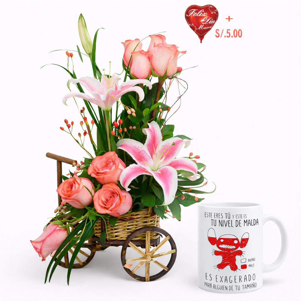 Elaborado con 3 rosas importadas, 1 clavel, lilium aromático y follaje de vivero, todo dispuesto armoniosamente sobre una base roja que resalta sus colores y lo convierte en un presente encantador.