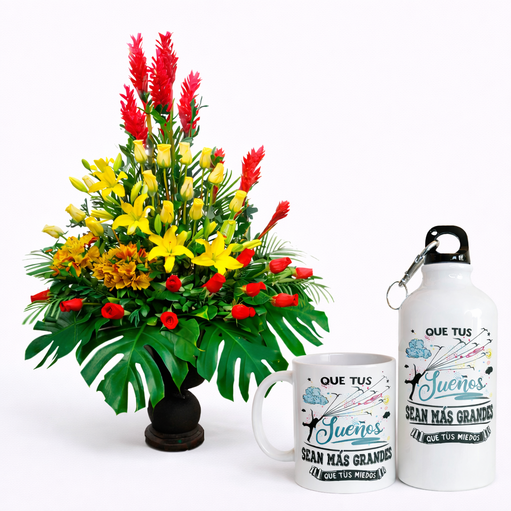 Presentado en una base de metal, este majestuoso diseño combina liliums blancos y 20 rosas rojas, con delicados toques de claveles rojos, flor de iris y margaritas blancas, creando una composición armoniosa que transmite alegría y sofisticación para regalar en cualquier ocasión especial.
