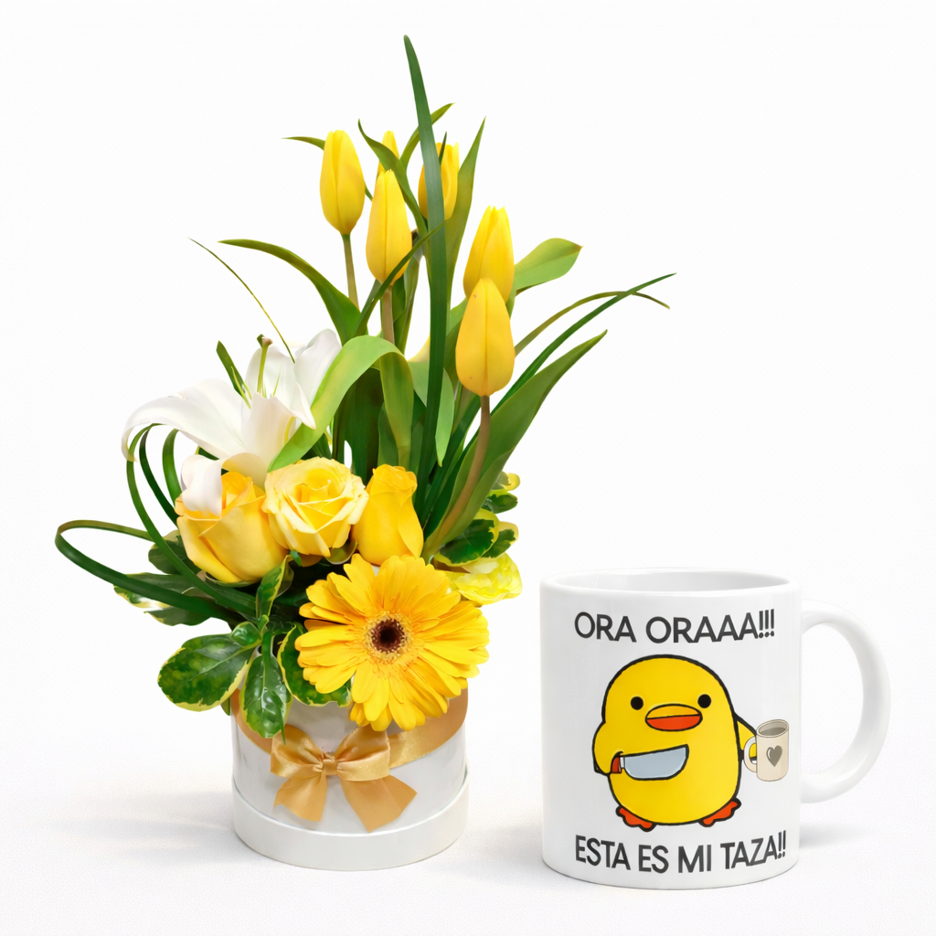 Está compuesto por 11 rosas amarillas importadas que aportan luminosidad y sofisticación con sus pétalos vibrantes. Se complementa con un lilium aromático de flores blancas y fragantes que añaden frescura y serenidad al diseño. La flor de iris, con sus tonos morados y azules, brinda un toque de carácter y armonía. El follaje fino natural enriquece la composición, y todo se presenta en una elegante base de cerámica que realza su estabilidad y belleza.
