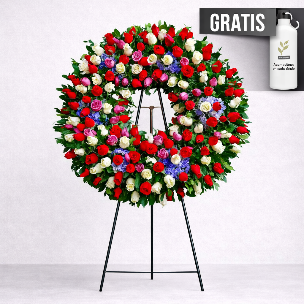 Acompañado de follajes finos naturales de vivero, el arreglo se presenta sobre un trípode de fierro que le brinda firmeza y altura. Con una altura aproximada de 1.50 metros, es una pieza visualmente impactante, ideal para ceremonias de despedida o tributos conmemorativos.