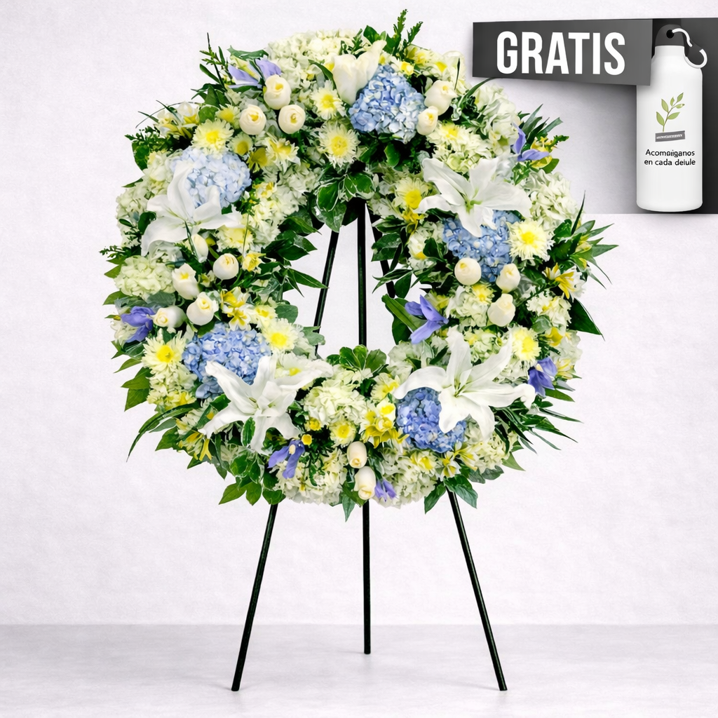 Compuesto por hortensias blancas y azules, 13 rosas blancas importadas y 3 flores de iris, esta armoniosa combinación transmite paz, sobriedad y consuelo en momentos solemnes.