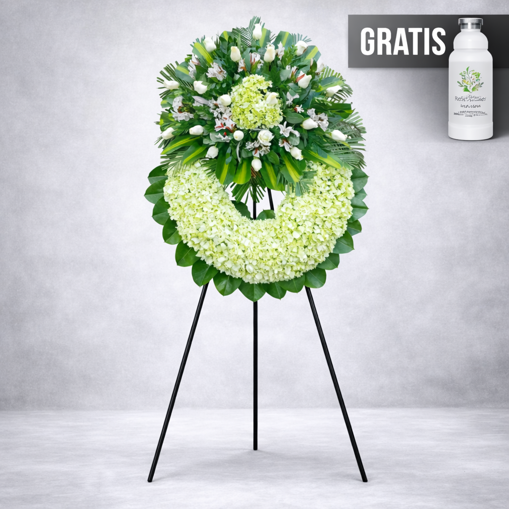 Este solemne arreglo floral, de aproximadamente 1.80 metros de altura, está compuesto por rosas blancas, calas, iris, hortensias y follajes de vivero. Cada flor ha sido dispuesta con delicadeza para transmitir paz, respeto y serenidad. Su combinación de flores frescas y elegantes le otorga una presencia imponente y digna, ideal para homenajes y despedidas solemnes.