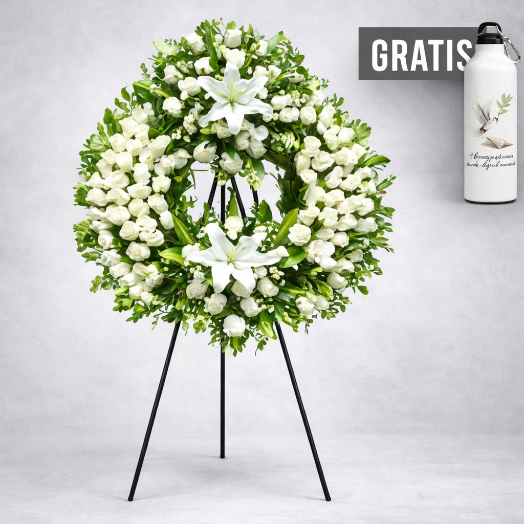 Con una altura aproximada de 1.80 metros, está compuesto por rosas blancas, lilium blanco aromático y follajes finos de vivero, cuidadosamente seleccionados y dispuestos para lograr una composición equilibrada y simbólica.