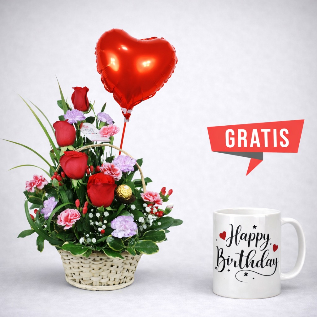 Hermoso arreglo floral presentado en una fina canasta, elaborado con 30 rosas rojas importadas, acompañado de 2 globos en forma de corazón y 1 globo de cumpleaños, además de un tierno peluche y follaje fino. Un detalle perfecto para sorprender con amor, alegría y un toque especial en cualquier ocasión.