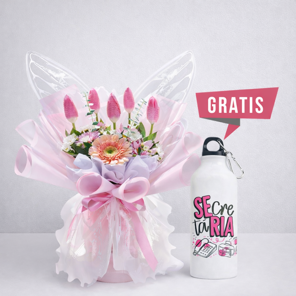 Elaborado con seis rosas rojas que aportan elegancia y romanticismo, acompañado de un lilium rosado que brinda un toque de frescura y distinción. Se complementa con delicados toques de flores silvestres y se presenta con una envoltura especial que realza su estilo natural y armonioso.