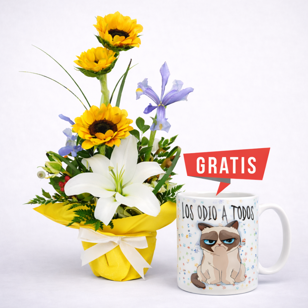 Este delicado arreglo está compuesto por 4 rosas importadas que aportan un toque romántico, acompañadas de 2 gerberas vibrantes que llenan de alegría el diseño. Incluye 1 hortensia de suaves tonos, 2 iris en matices morados y azules que transmiten serenidad, lilium perfumado que añade una fragancia encantadora y astromelia rosada que aporta un sutil toque de color. Todo se complementa con fino follaje natural que armoniza la composición.