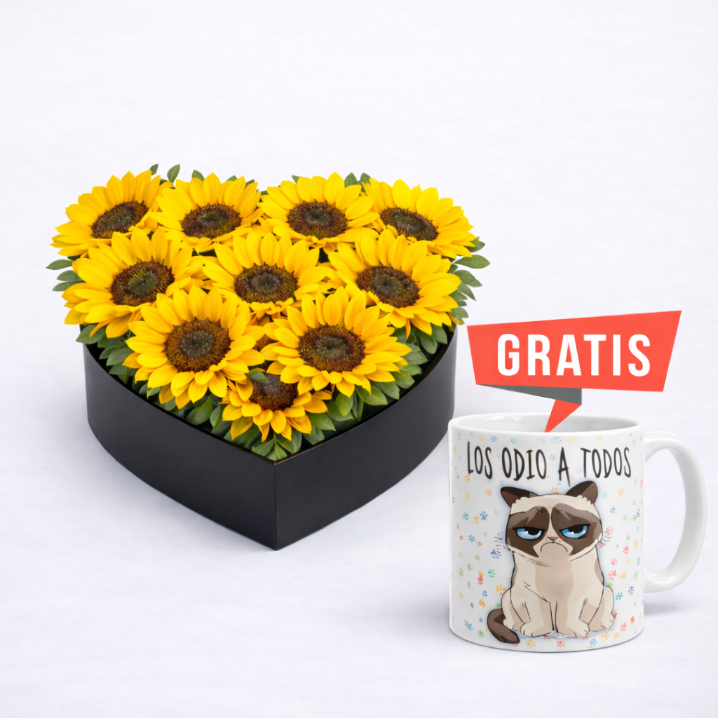 Este delicado diseño está compuesto por 8 rosas rojas importadas que aportan sofisticación y romanticismo, acompañadas de 6 girasoles radiantes que llenan el arreglo de calidez y energía. Se complementa con fino follaje natural que añade frescura y equilibrio visual, todo presentado sobre un elegante box decorado que realza la belleza de la composición.