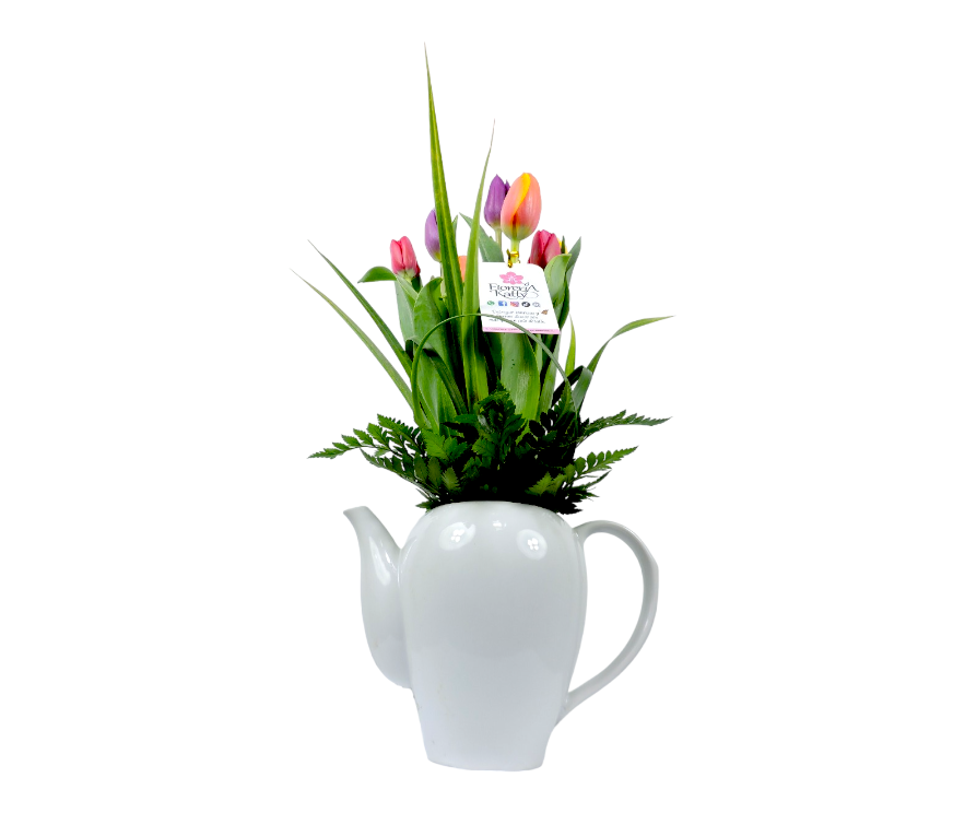 Hermosos 8 tulipanes de colores y follaje fino sobre una jarrita en agua.