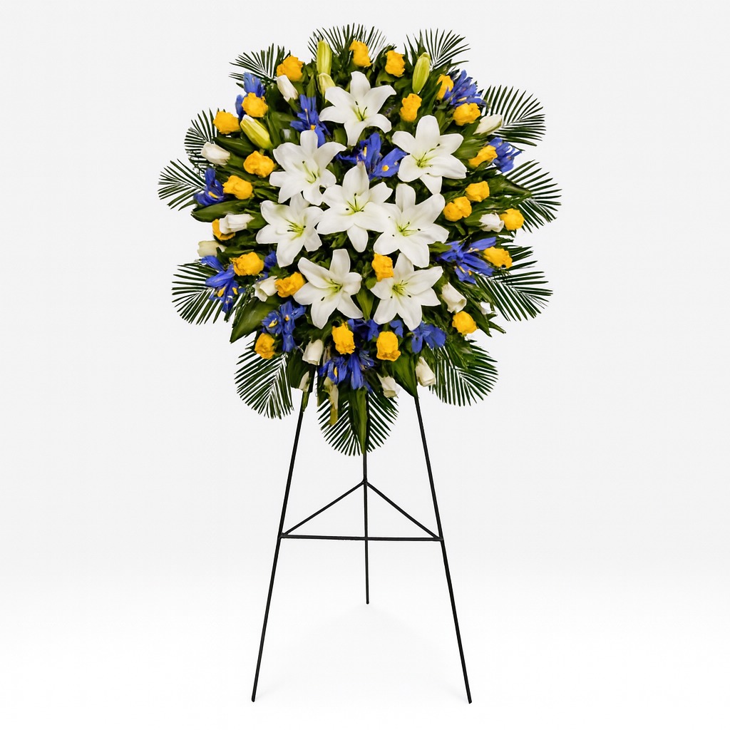 Montada sobre un parante de fierro, esta cruz floral destaca por su imponente altura y presencia, siendo ideal para rendir un homenaje lleno de respeto y elegancia.