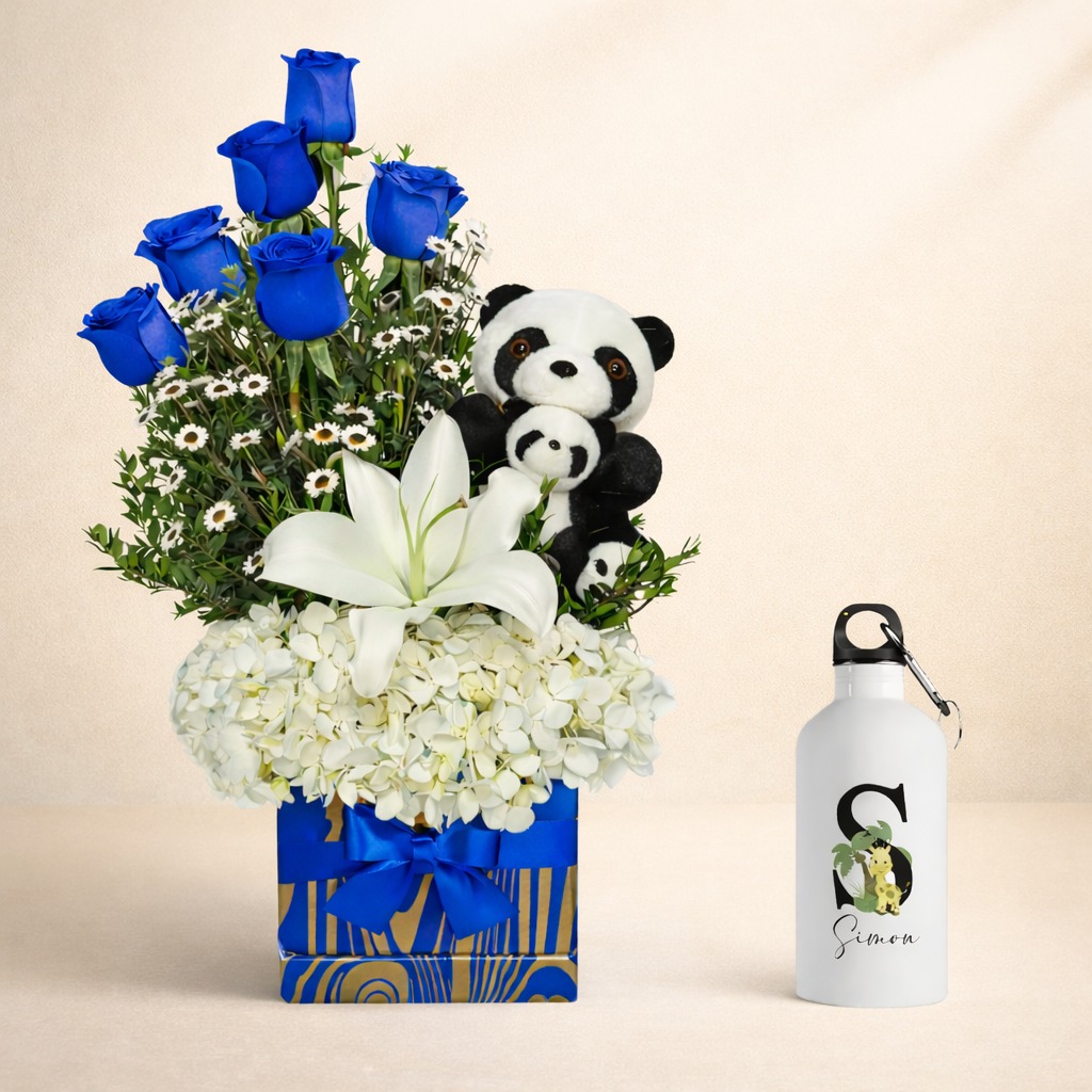 Este arreglo combina 5 rosas azules importadas, lilium aromático, hortensias y follaje fino, creando una composición elegante, fresca y delicada. Incluye un oso panda antialérgico y un tomatodo personalizado de aluminio, ideal para agregar la foto o frase que desees.