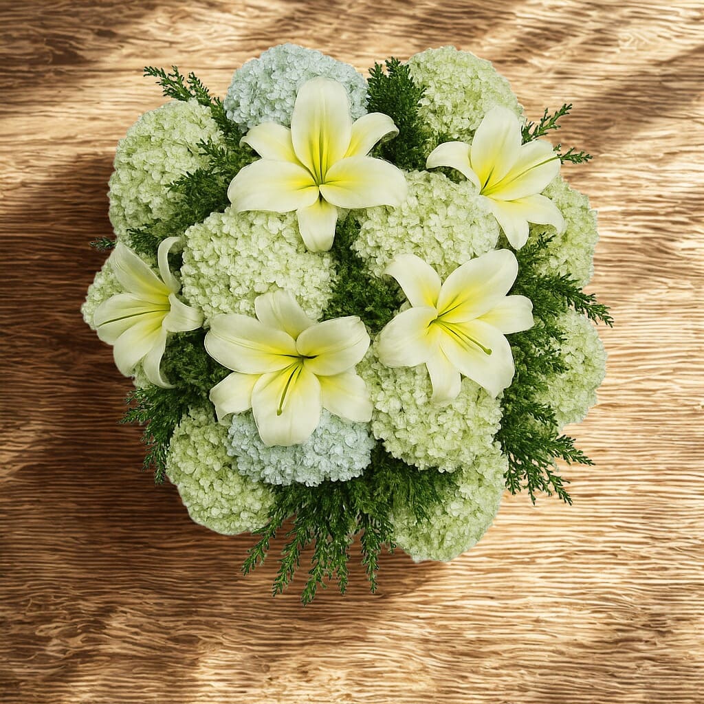 º Flores principales: Hortensias delicadas y lilium aromático.