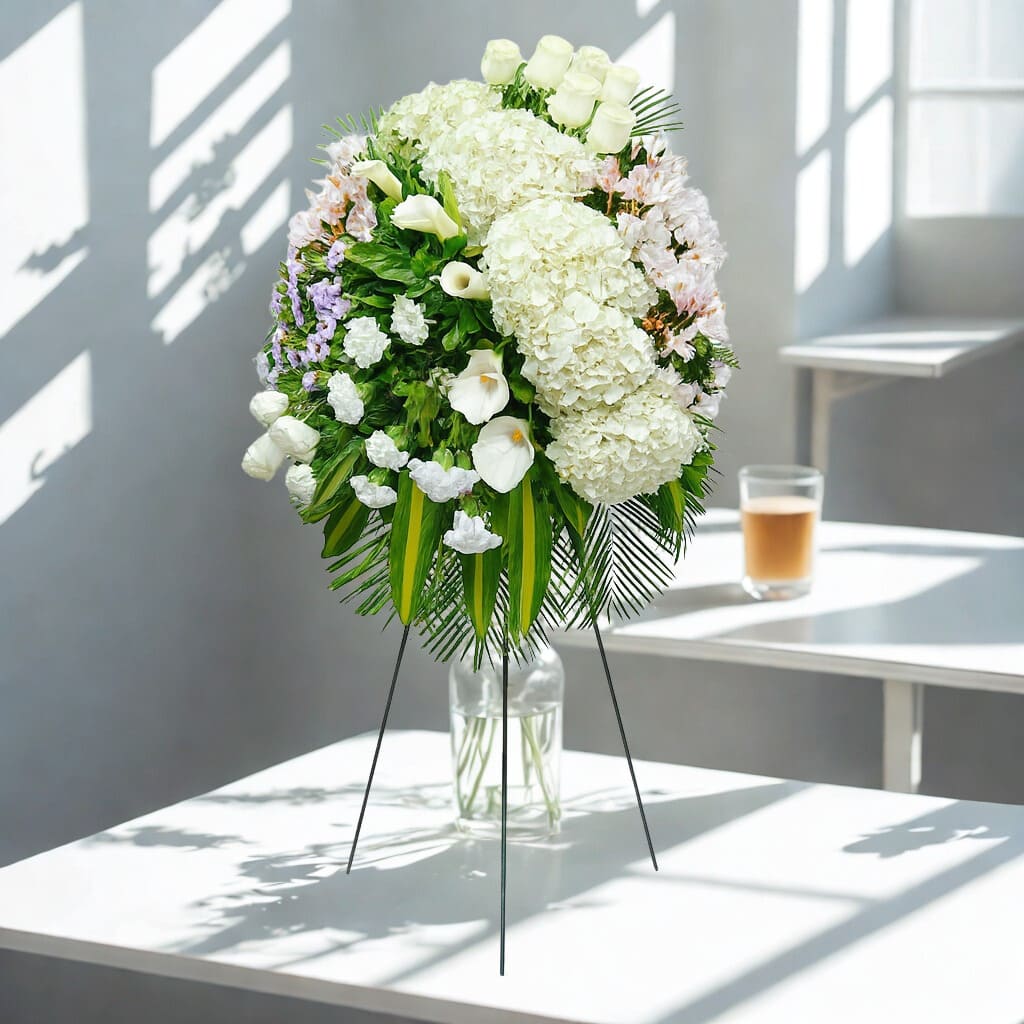 Con una altura aproximada de 1.50 metros, combina una cuidada selección de flores blancas —hortensias, margaritas, astromelias y claveles blancos— que evocan paz y solemnidad.