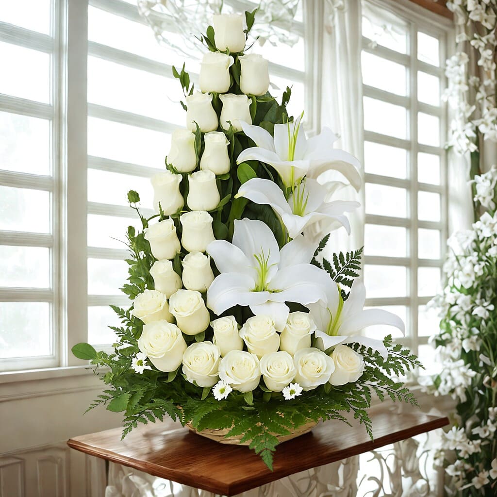 Compuesto por 24 rosas blancas importadas, lilium blanco aromático y delicadas margaritas blancas, esta composición transmite paz, ternura y armonía en cada flor.