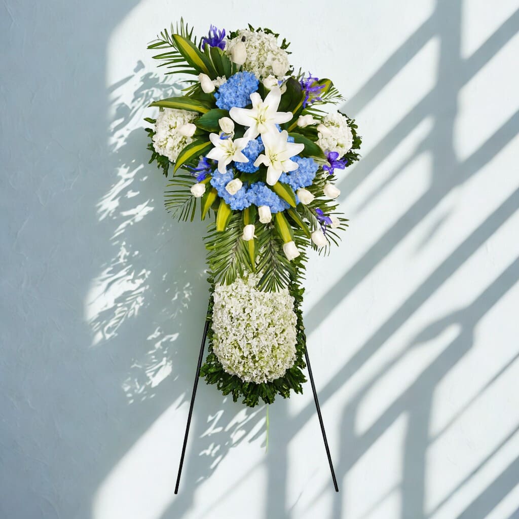 Con una altura aproximada de 1.80 metros, combina delicadas 5 hortensias blancas y celestes, 20 rosas blancas importadas, 5 flores de iris y 3 lilium blanco aromático, creando una composición serena y armoniosa.