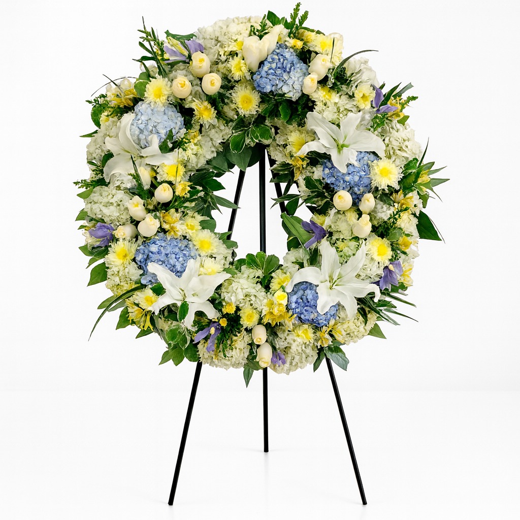 Con una altura aproximada de 1.80 metros, combina una vibrante selección de flor de iris, margaritas, gerberas de vivero, lilium blanco aromático y follajes finos naturales, dispuestos con delicadeza para transmitir alegría, serenidad y respeto.