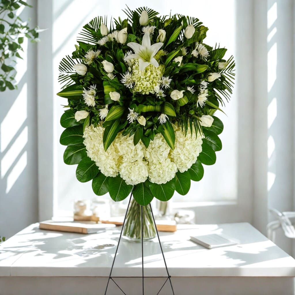 Nuestra Corona Floral de Homenaje, de 1.80 metros de altura, es una pieza elegante y solemne, ideal para momentos conmemorativos. Combina rosas, lilium aromático, hortensias blancas y follajes de vivero, dispuestos con delicadeza para transmitir serenidad y respeto. Se sostiene sobre parantes robustos que aseguran estabilidad y dignidad durante su exposición.