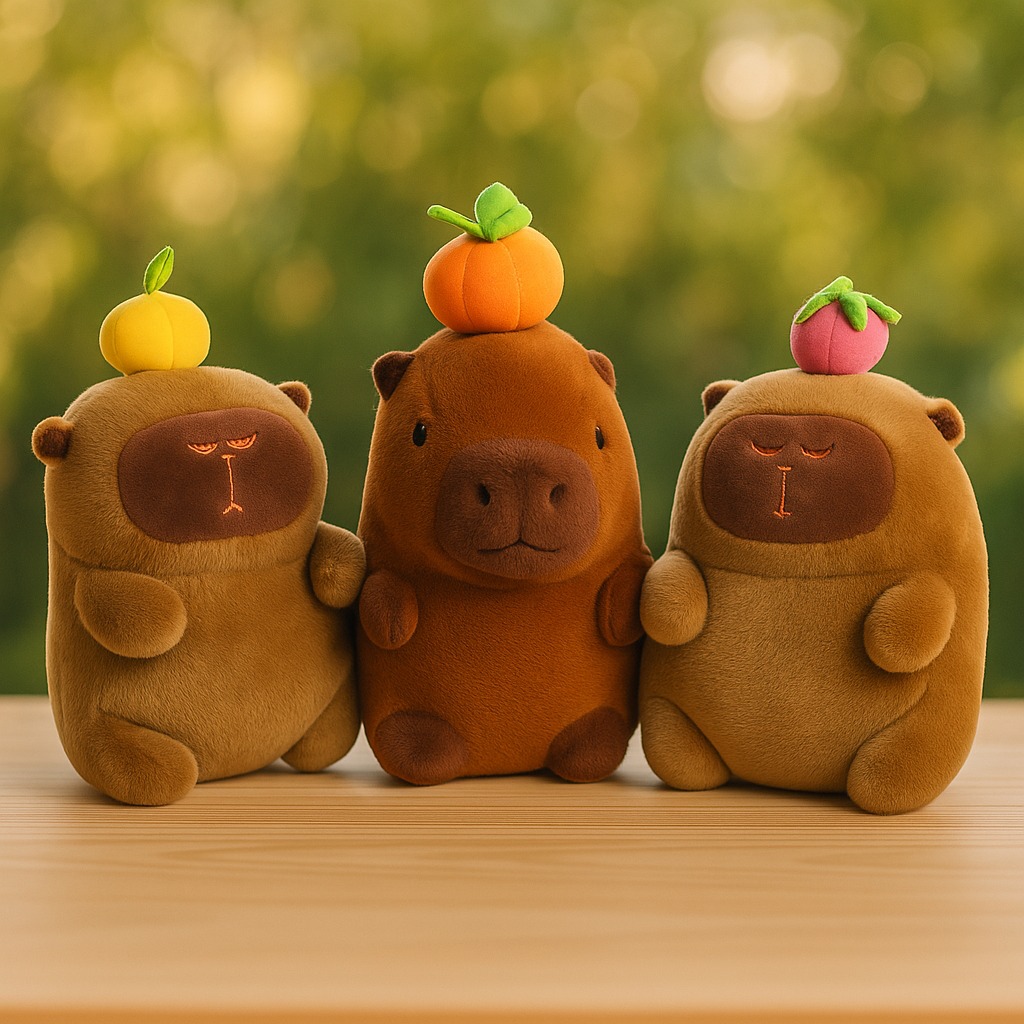 Lindo peluche de capibara con fruta, elaborado en material hipoalergénico y súper suave al tacto.