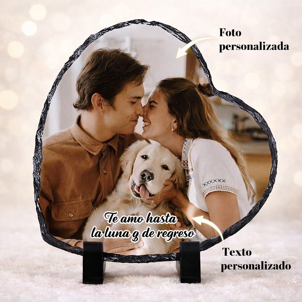 Creamos foto roca sublimada en forma de corazón, personalizada con tus fotografías, nombres y fechas, transformando cada imagen en un recuerdo lleno de significado.