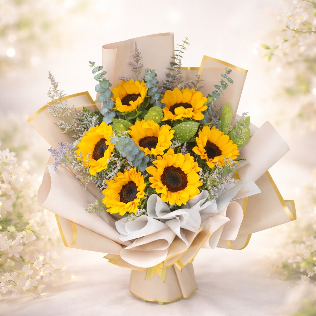 Hermoso ramo de 7 girasoles con follaje fino, presentado en envoltura de papel especial. Un detalle vibrante y elegante, ideal para transmitir alegría en cualquier ocasión.