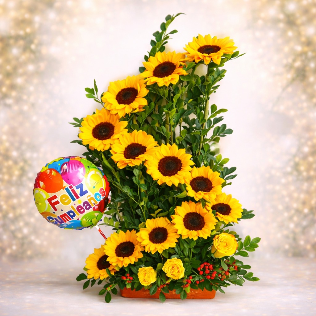 Este vibrante arreglo floral está compuesto por 12 girasoles radiantes y 3 rosas amarillas importadas, que aportan luz, energía y un toque de elegancia. El imperico y el follaje fino de vivero complementan el diseño, brindando textura y frescura natural. Todo el conjunto se presenta en una base de cerámica, acompañado de un globo metálico chico, ideal para realzar cualquier celebración.