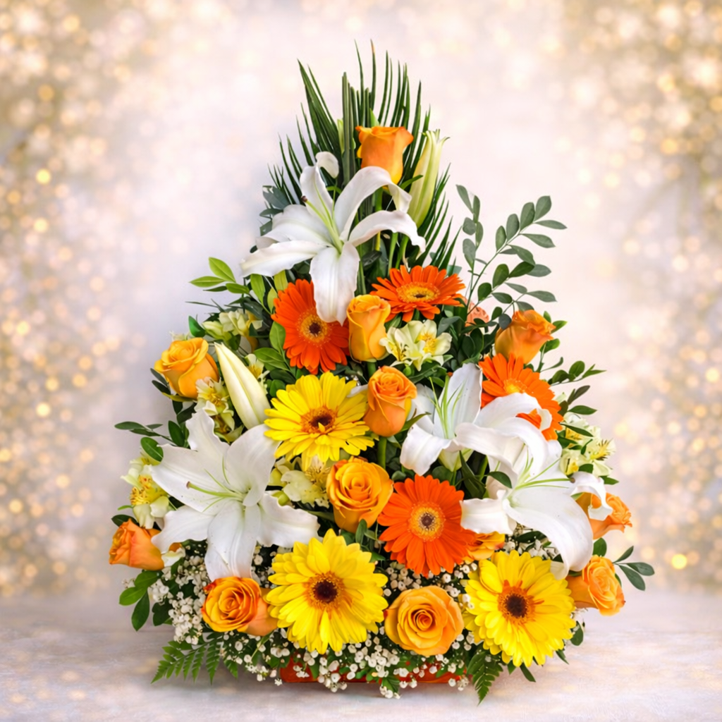 Este hermoso arreglo floral combina gerberas en tonos amarillos y naranjas con rosas amarillas importadas, astromelias blancas y lilium blanco, creando una composición vibrante, elegante y llena de energía. Las lluvias y los follajes finos aportan frescura y movimiento, mientras que la base de cerámica realza su presentación con un toque sofisticado. Ideal para transmitir alegría, gratitud y buenos deseos en cualquier ocasión.