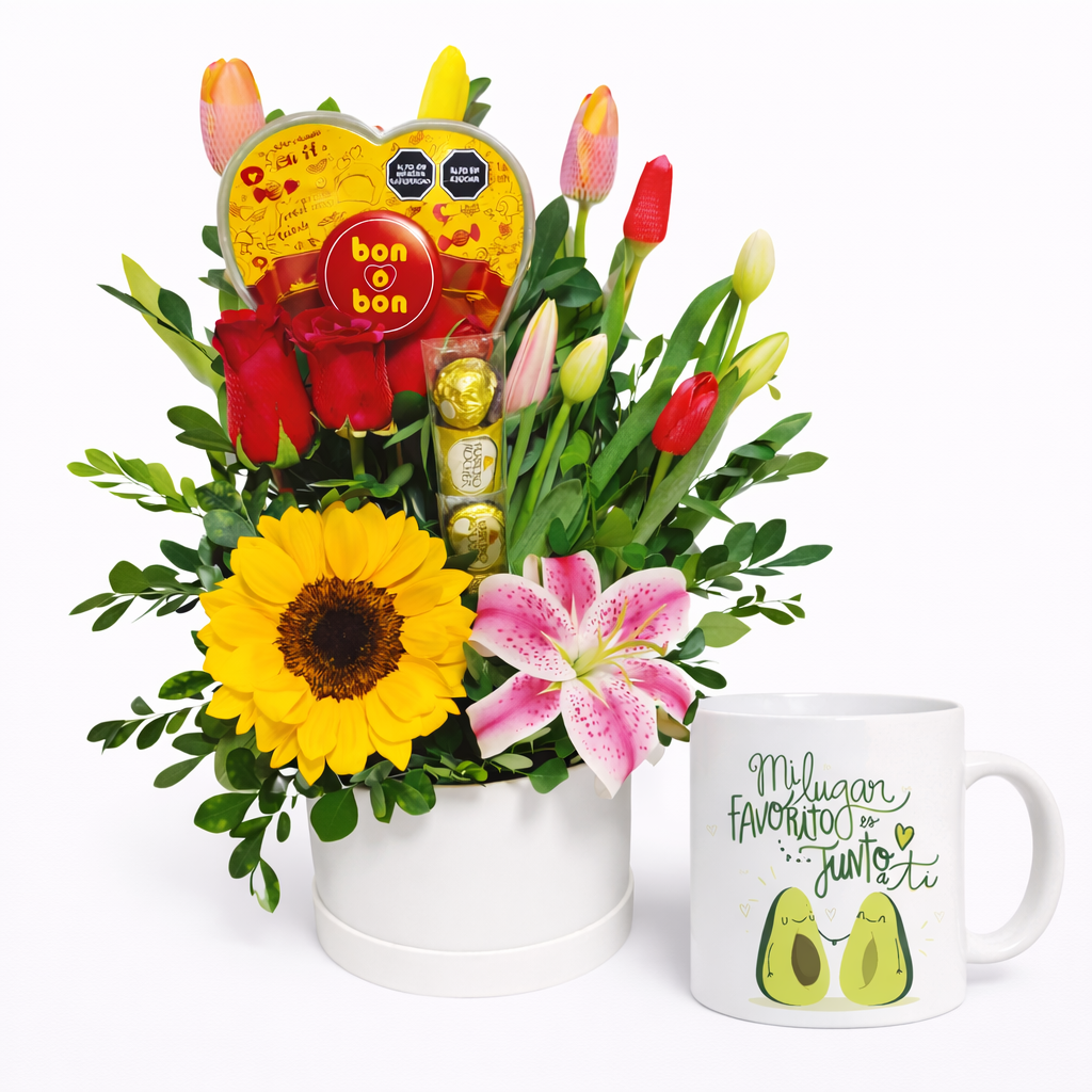 º Flores principales: 4 rosas importadas y 2 girasoles