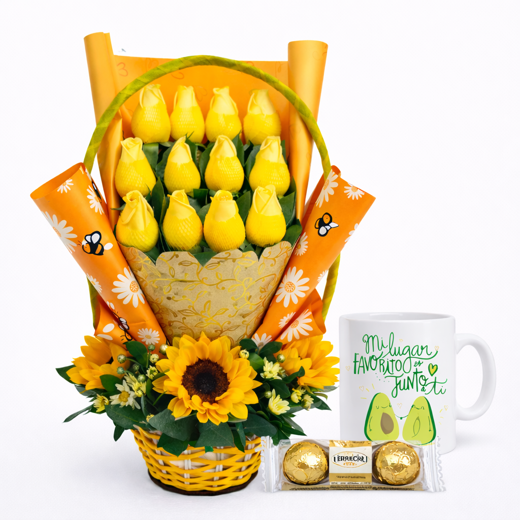 El arreglo incluye 12 rosas rojas frescas, 3 girasoles radiantes y delicado follaje, presentado en una elegante canasta con decoración de papel coreano.