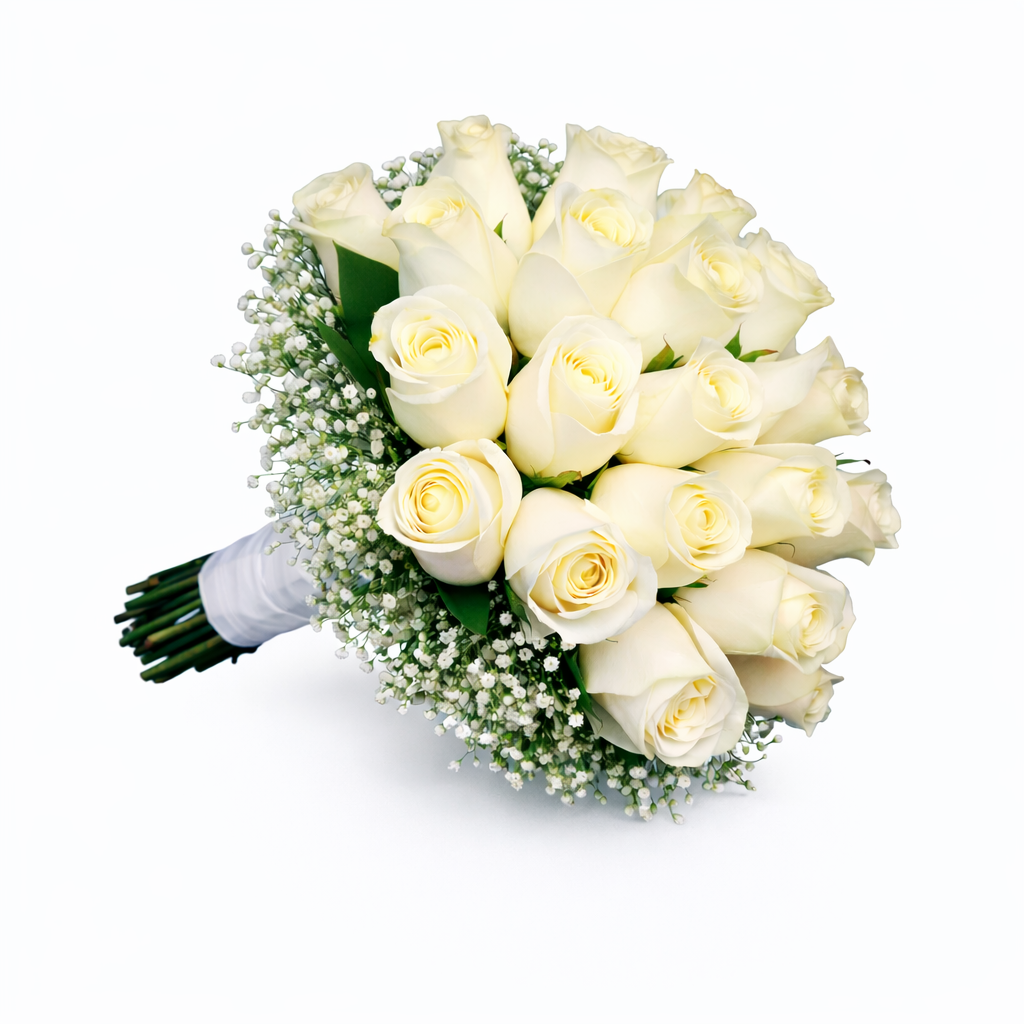 Hermoso arreglo floral elaborado con 24 rosas blancas importadas, acompañadas de delicados toques de rosas enanas y finos follajes de vivero que aportan frescura, volumen y elegancia al diseño. Una composición sofisticada y armoniosa, ideal para sorprender en ocasiones especiales.