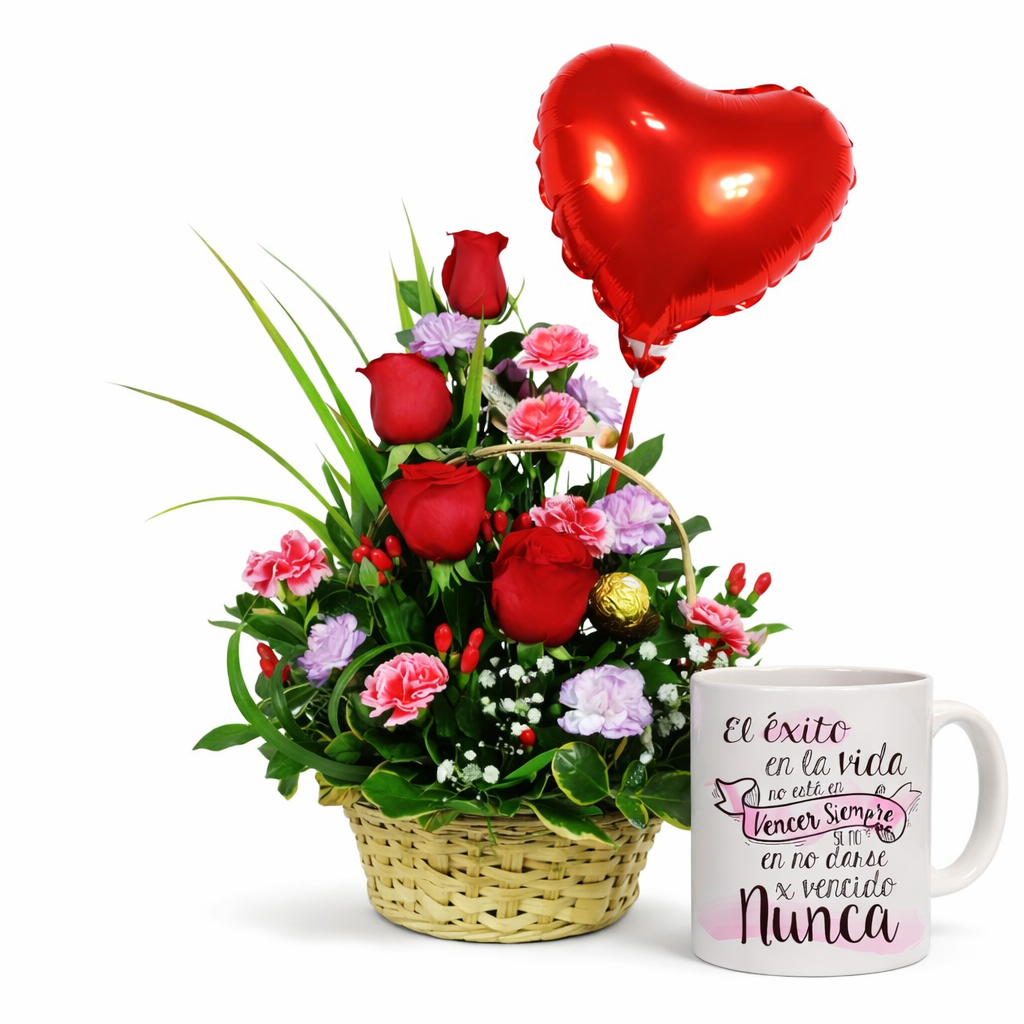 Hermoso y alegre arreglo compuesto por 4 rosas rosadas importadas, 1 lilium rosado aromático, 2 flores de iris y follaje fino natural, acompañado de un globo metálico decorativo que añade un toque especial. Todo dispuesto en una elegante base de cerámica.